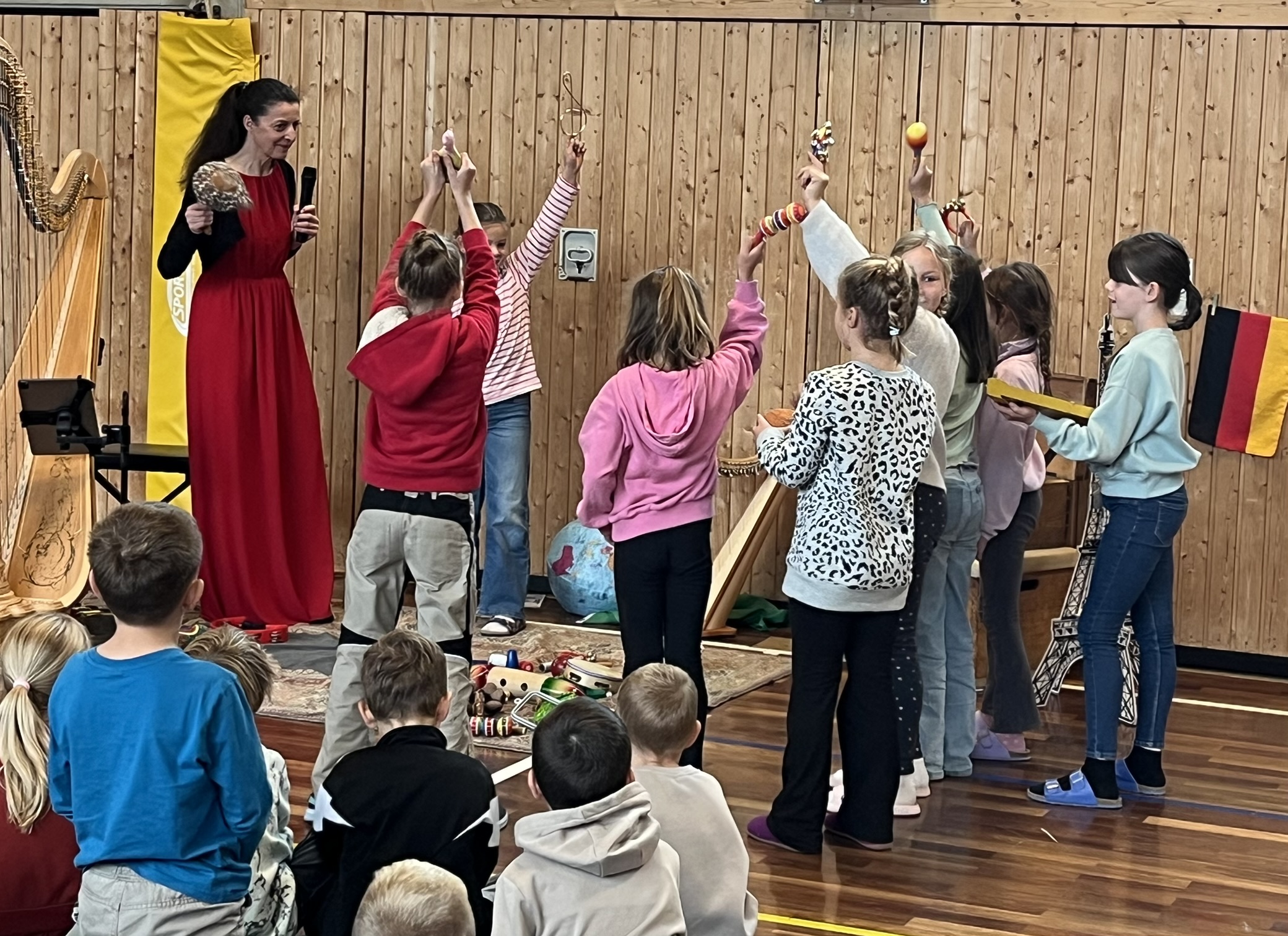 Frau Aichhorn reiste mit ihrem besonderen Instrument nach Welldorf und nahm die Kinder und die Lehrkräfte in zwei Mitmach-Konzerten mit auf eine musikalische Reise um die Welt.