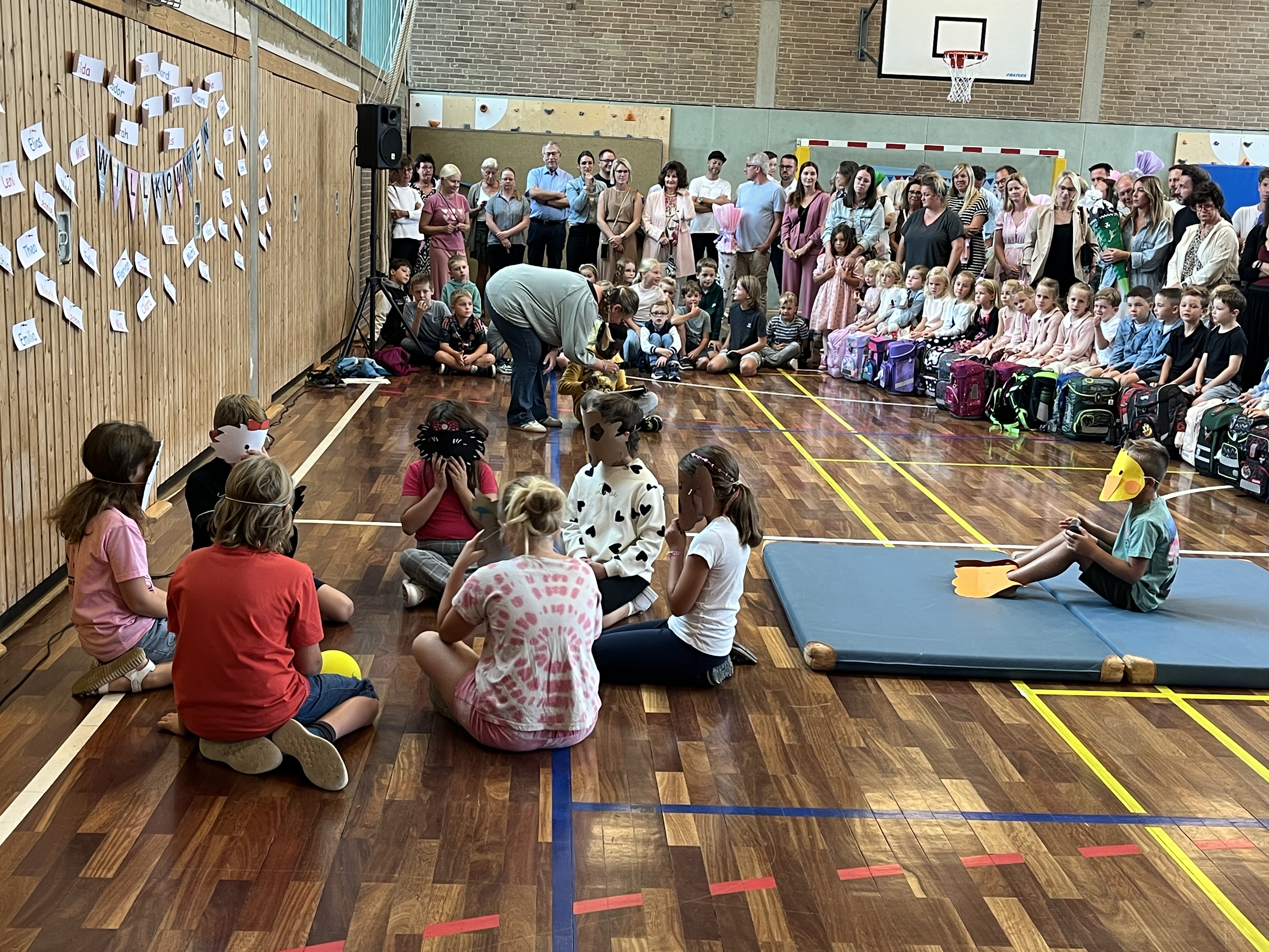Die Kinder der Frosch- und der Mäuse-Klasse begrüßten die I-Dötzchen mit einem Begrüßungslied, dem Schul-Song und einem kleinen Theaterstück zum Thema Freundschaft, bevor die Mädchen und Jungen zu Drachen- und Löwen-Kindern wurden und mit Heike Bleck und Jonas Hanek zur ersten Stunde in ihre Klassen gingen.