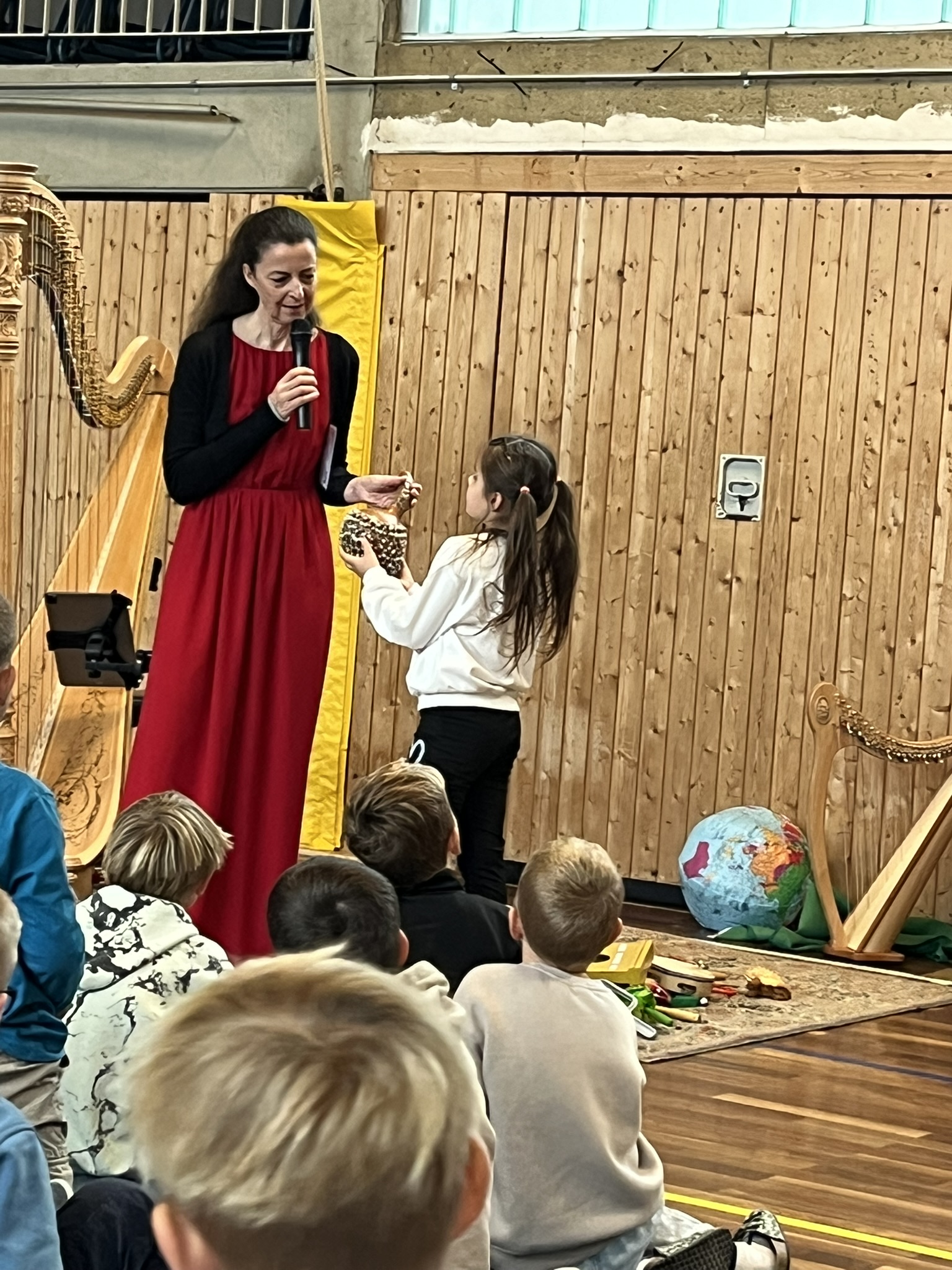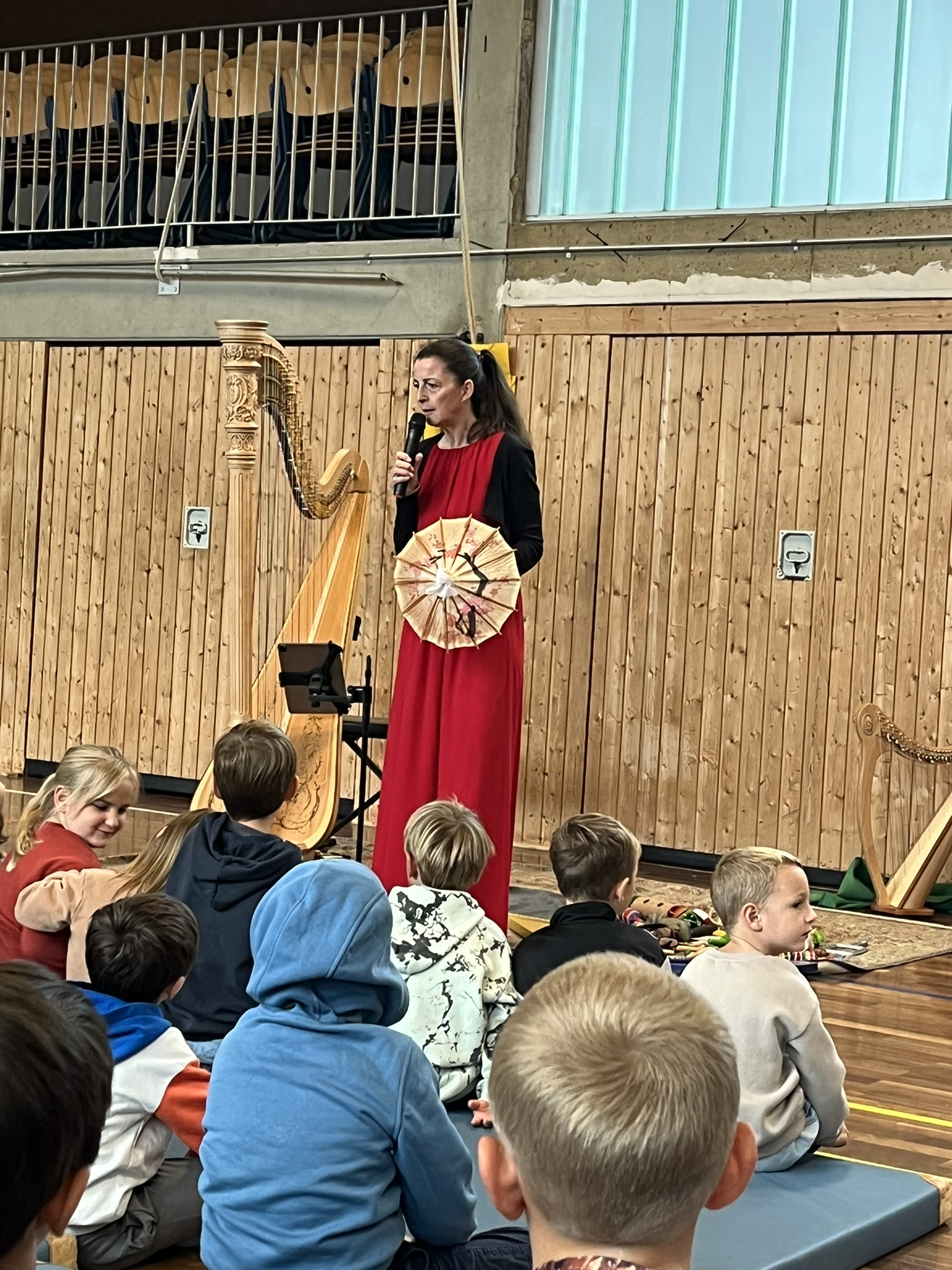 Auf ihrer Harfe ließ sie schöne Weisen aus Deutschland, Irland, Frankreich,  dem Kongo, den USA, Japan, Tschechien und Österreich erklingen und erzählte Geschichten zu den Musikstücken und deren Komponisten.